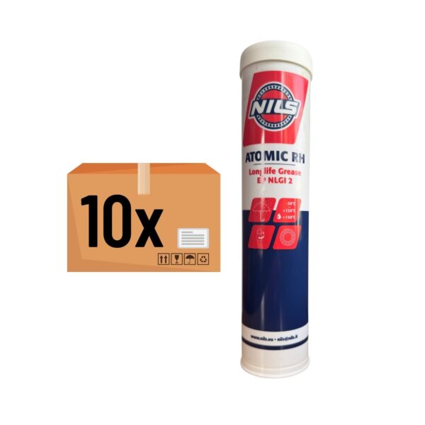 Zestaw smarów 10x NILS Atomic RH Longlife Grease EP NLGI 2. Wysokowydajny smar o przedłużonej żywotności, stworzony z dokładnie kontrolowanych surowców i przy użyciu specjalnego procesu produkcji. Charakteryzuje się wyjątkową odpornością na ekstremalne naciski oraz doskonałą stabilnością w obecności wody, w tym wody słonej. Ten bezbarwny smar o pomarańczowej fluorescencji wyróżnia się silną przyczepnością, zapewniając trwałą ochronę w trudnych warunkach. Smar odpowiedni do różnych typów pojazdów i maszyn, takich jak samochody, ciężarówki, motocykle oraz maszyny przemysłowe. Doskonale sprawdza się także w sprzęcie do robót ziemnych (koparki, ładowarki, walce) oraz pojazdach rolniczych, takich jak traktory i kombajny. Przedłużony okres między smarowaniami aż do 3-8 razy w porównaniu ze standardowymi smarami.