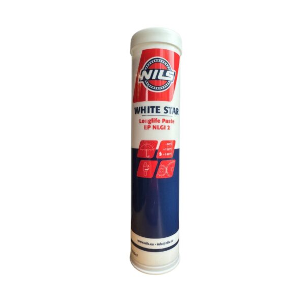 NILS White Star to smar nowej generacji, stworzony do długoterminowego smarowania ciężkiego sprzętu budowlanego, takiego jak wolnoobrotowe łożyska, sworznie i koła zębate. Popularny do konserwacji dźwigów i żurawi. Jest wyjątkowo odporny na wypłukiwanie przez wodę z łożysk i ślizgów, zapewniając niezawodną ochronę nawet w warunkach intensywnej wilgoci, wibracji oraz dużych obciążeń. Specjalna formuła, zawierająca specjalne białe dodatki, zapobiega korozji i wydłuża okresy między smarowaniami nawet 4-8 razy w porównaniu ze standardowymi smarami, gwarantując długą żywotność smarowanych elementów.
